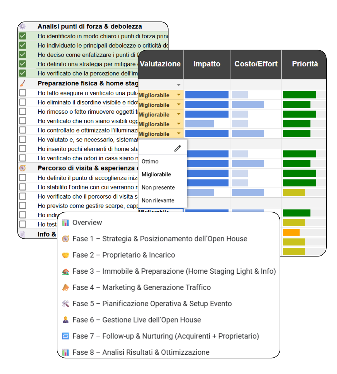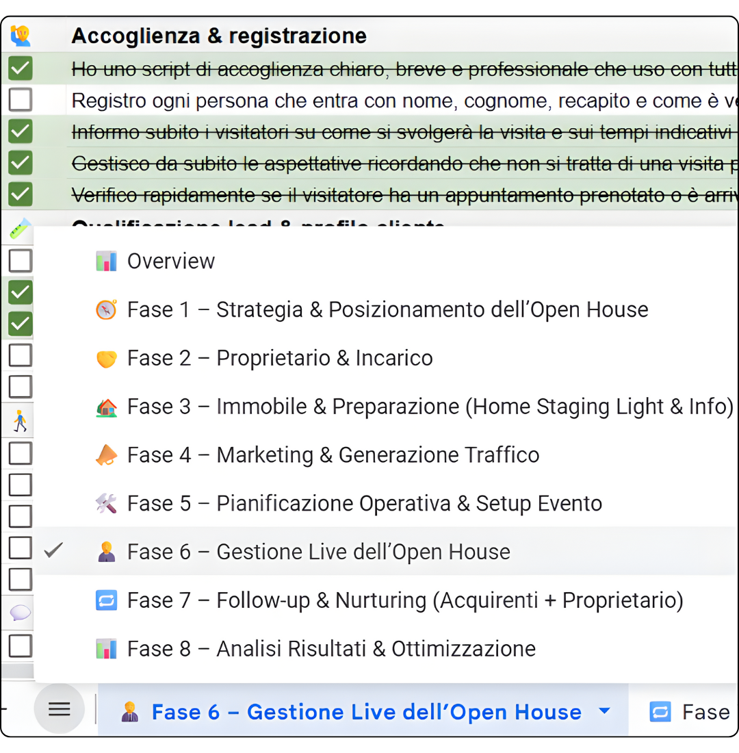 Una checklist unica che raccoglie tutte le 8 fasi dell’open house, con più di 200 checkpoint già pronti. Hai in un solo posto tutto quello che devi controllare prima, durante e dopo l’evento, senza inventare nulla da zero.
