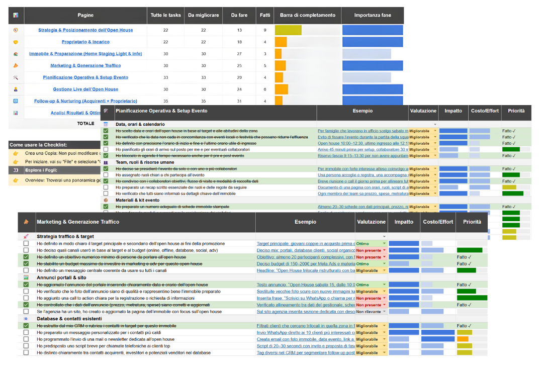 No, non è un corso e non è un manuale generico. È una checklist operativa strutturata in 8 fasi, con checkpoint concreti del tipo “fatto / non fatto”, esempi pratici e sistema di valutazione (Ottimo, Migliorabile, Non presente, Non rilevante) con impatto, effort e priorità. In pratica ti dice cosa fare, in che ordine e cosa conta di più per far rendere davvero l’open house.